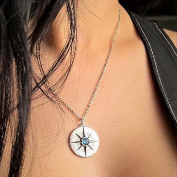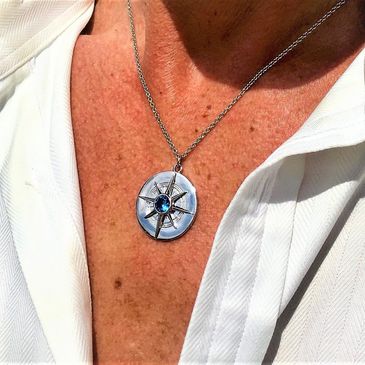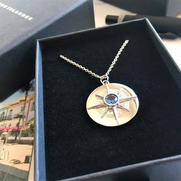 The necklace is designed in The Åland Islands by a proud islander, Joakim Eriksson and builds on a compass rose with a blue cubic zirconia to symbolize the water.
